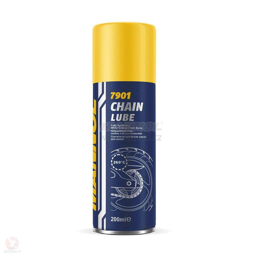 Mannol Chain Lube je plně syntetické bílé mazivo ve formě aerosolu, navržené pro vysoce zatížené a rychloběžné hnací řetězy motocyklů, čtyřkolek, skútrů a dalších motorových vozidel, stejně jako pro jízdní kola. Toto mazivo je vhodné pro všechny typy řetězů, včetně O-ring, X-ring a W-ring variant. Díky zvýšené lepivosti se pevně drží na nejrychleji se pohybujících řetězech i při vysokých odstředivých silách, což zajišťuje spolehlivé mazání za všech provozních podmínek.